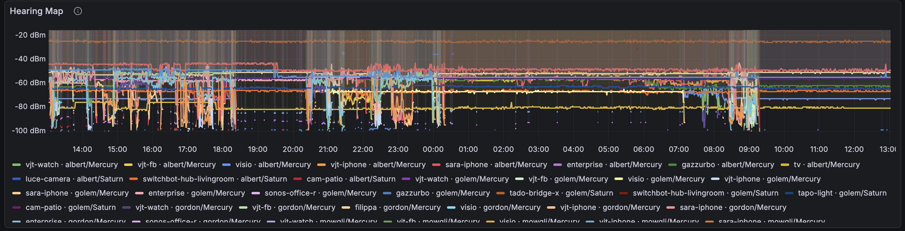 Each row is a WiFi client, the color shows which AP it’s connected to. Healthy clients show long solid bars. Sick ones look like barber poles. See sara-iphone? That rainbow stripe is 129 connects in 24 hours — the phone is walking through an overlap zone between two APs where both have roughly equal (and terrible) signal.