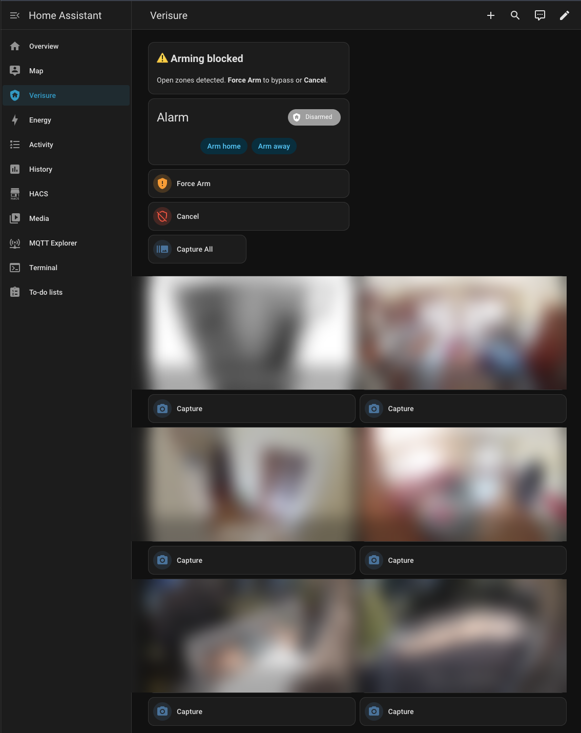 - Force arm — when the alarm won’t arm because a window is open, one tap to force it. Or better: an automation that forces automatically when you leave