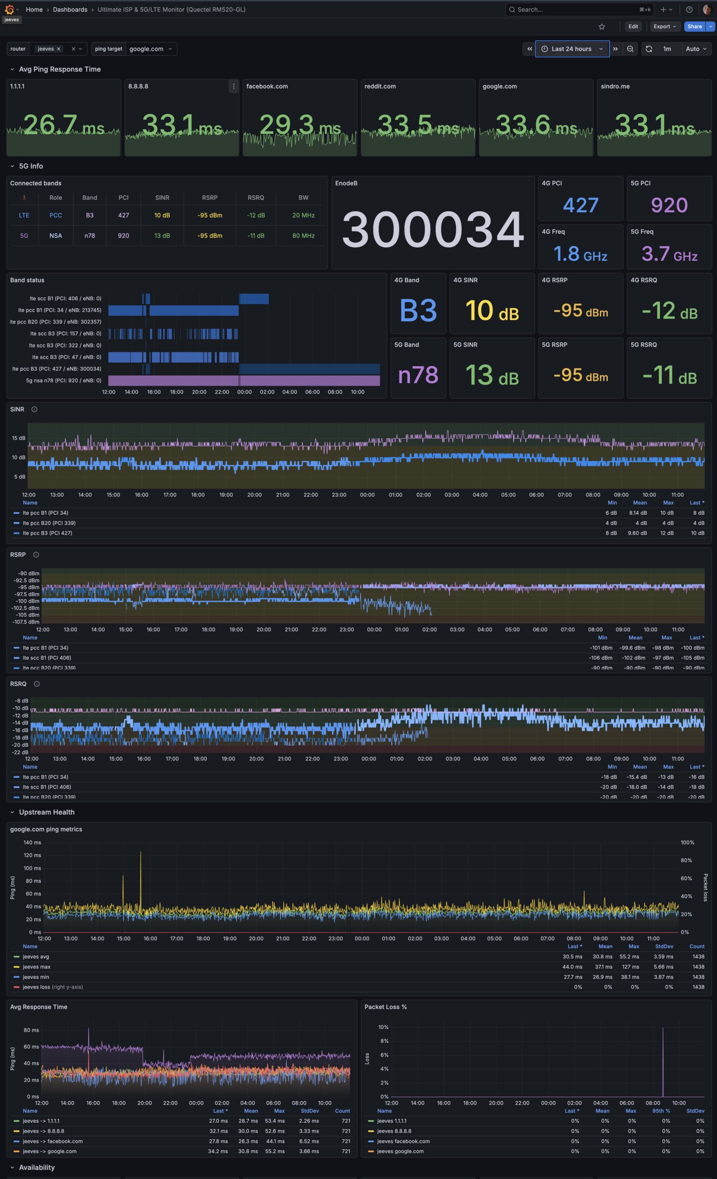 quectel-5g-tools— a collection of Lua tools I wrote for monitoring and interacting with the Quectel modem.5g-infodumps a full snapshot,5g-monitoris a live TUI with signal quality display and configurable audio beeps,5g-lockhandles band and cell locking,quectel-atis a zero-ceremony AT command wrapper. There’s also a Prometheus collector — that’s what feeds this Grafana dashboard — and5g-led-bars, a procd daemon that drives the four signal-bar LEDs on the GL-X3000’s front panel in real time, off the 5G RSRP (signal strength) when the modem is attached, or the 4G RSRP when 5G is down.qfirehose1.4.17 — the standard Quectel firmware flasher. Upstream is currently at 1.7, but I picked 1.4.17 (originallynippynetworks/qfirehose) because it was the version pre-packaged in another reputable OpenWrt feed and had been stable for everyone using it. I forked it to add a clean OpenWrt package recipe so the binary lands directly in the image — built and shipped through my own openwrt-builder like every other custom package on this router.adb+fastboot35.0.2 — for modem USB composition switches and ADB access into the SDX62.wifi-dethrash-collector— a Prometheus collector tracking Wi-Fi parameters, paired with the client-thrash analysis it grew out of.- A rootfs overlay with my internal CA and my package-feed signing keys.