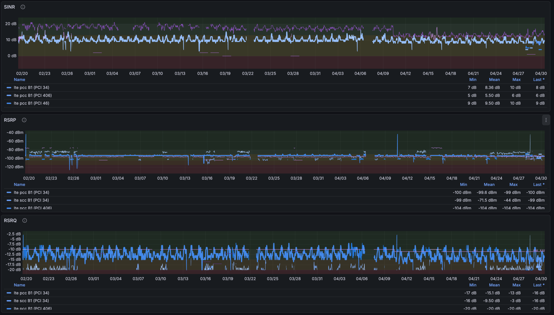 I’ve been collecting RSRP, RSRQ, SINR, band, PCI, and carrier aggregation state via quectel-5g-tools since January, fed into an internal VictoriaMetrics. The telemetry made it unambiguous: the SINR drop happened weeks before I touched the firmware. Same signal strength (flat RSRP), 6 dB more noise, same PCI, no handover. The migration is not the cause. I didn’t roll back to stock — confidence from data, not from hope.