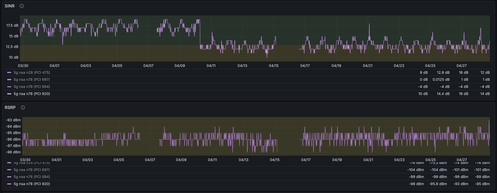 About two weeks before this migration, my 5G SINR dropped from a baseline of around 18 dB to 12 dB — over the course of a couple of minutes. Same RSRP, same cell, same beam, just 6 dB more noise. Nothing changed on my side. I wasn’t watching the dashboard at the time, and didn’t notice.